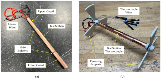 A 9.53 mm diameter copper tube was chosen as the basis of the assembly and was driven primarily by the desired heaters and their available sizes. Flexible polyimide heaters, roughly 0.127 mm thick, would be used for the test section and guards and were sourced from Omega Engineering (Norwalk, CT, USA). In addition, with numerous options available at 25.4 mm wide, the heaters could be rolled into a cylinder with a dimeter of roughly 8 mm without overlap. The tube was bored out to a diameter as close to 8 mm as possible, and the thin heater cylinders slid into the tubes to fit snugly—and, more importantly, uniformly—against the inner wall. The heater wires could be routed through the middle of the tube stack and terminated at the top of the assembly, leaving a uniform, clean outer tube surface area. Although this configuration resulted in a thermal short between the test section and guards through the wires, because each heater would be controlled to the same temperature, at steady state, there should be no axial heat transfer. As for the thermocouples, a concession had to be made, as it was not practical to adhere them to the inner tube wall, nor was this desirable, as the outer surface temperature was the point of interest. As such, the thermocouples were secured to the outside of the assembly using copper tape, and the wires were routed vertically to meet up with the heater wires at the top of the assembly. Small-diameter 36-gauge wire was used for the thermocouples to minimize their impact on the uniformity of the outer surface area.