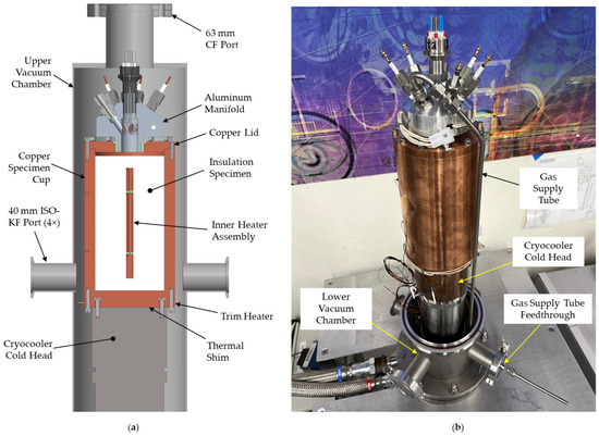GHC final assembly: (a) CAD model cut-away showing major components; (b) as-tested configuration showing gas supply tube and lower vacuum chamber (most wiring and MLI not shown for clarity).
