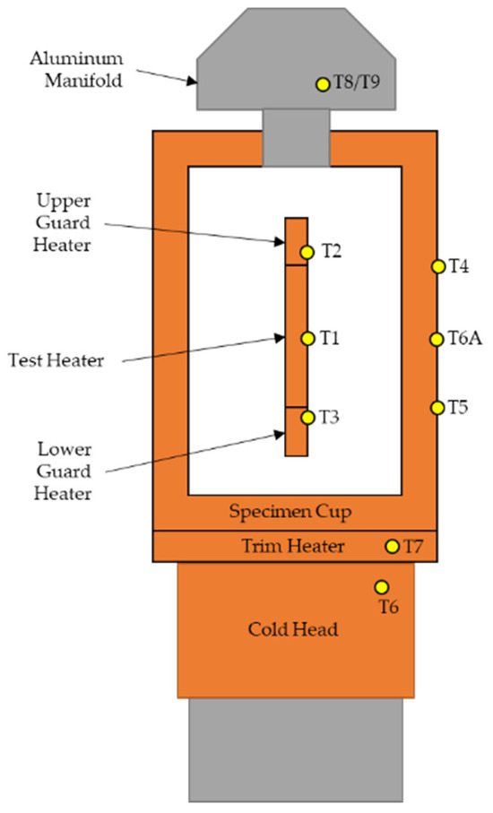 Figure 1 shows the heater assembly, which consists of three independent heating elements: a center test section with upper and lower guards. Each heater is controlled to the same temperature (the WBT) to eliminate axial heat flow through the assembly and to create a steady-state, uniform temperature profile through the insulation thickness between the cold copper cup and warm test heater (within the region bounded by L and Δx). The voltage and amperage to the center test heater are used to determine the power supplied to maintain the warm boundary temperature (i.e., Q). At steady-state conditions and with a uniform temperature profile, this heater input power should be constant and equates to only heat moving radially though the insulation. Therefore, it can then be used in Equation (3) to determine the effective thermal conductivity of the material.