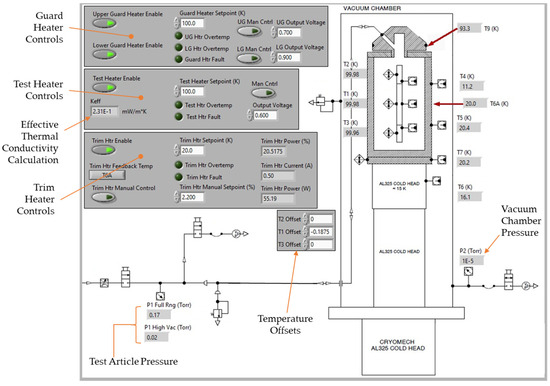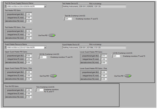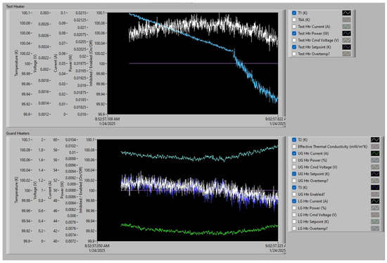 Figure 14 shows real-time data graphs for the inner heater assembly. These plots are critical to inform the test conductor during a GHC measurement as to the stability of a test and/or the trends so they can make necessary adjustments to the controls. During a successful steady state measurement, the guard and test section temperature and power (or current) plots remain relatively flat, with the temperatures at their setpoints (flat purple line) and with minimal fluctuation due to PID control. Due to the nature of the control logic—namely that there are three independently controlled heating elements on the inner assembly that can thermally communicate with each other—it is impossible to achieve completely flat, constant temperatures and input powers. However, in practice, it was found that very stable conditions are achievable, with indefinite temperature control of ±0.01 K or better routinely realized and with standard deviations on the test heater power of <0.01 W.
