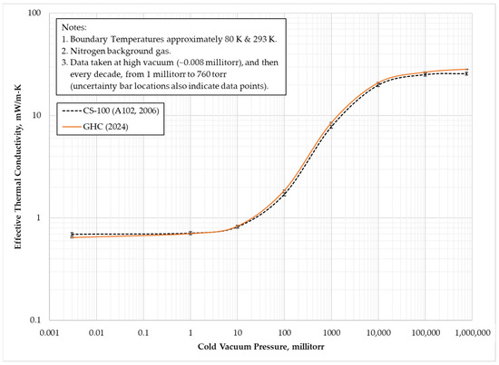 Effective thermal conductivity comparison of 3M K1 glass bubbles from GHC validation testing and standard [12] CS-100 LN2 boiloff calorimetry. Uncertainty bars are ±0.95% for the GHC (see the following section for uncertainty analysis) and ±3.3% for the CS-100 [10].