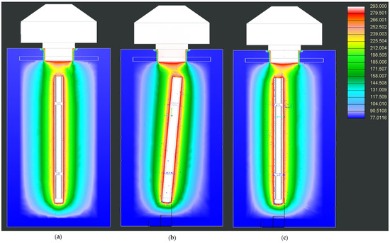 Internal thermal profiles of three GHC thermal model cases used for sensitivity analysis: (a) baseline, ideal case (internal heater assembly perfectly vertical and concentric); (b) internal heater assembly at 5° off-axis orientation; (c) vertical internal heater assembly, 7 mm off-center.