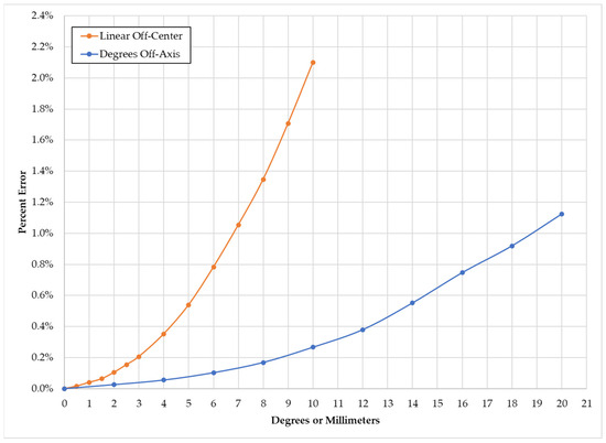 The percentage error associated with both deviation types in the inner heater assembly orientation are presented in Figure 17, covering ranges from 0 to 10 mm off-center and 0 to 20° off-axis. Figure 17 reveals that a GHC measurement is more affected by the concentricity of the heater assembly than by its angle off vertical and that the error is relatively small, well below 1%, for small deviations. The latter point is of significance because although the analysis was purposely conducted out to large deviations, in practice, only small variations are expected due to the nature of the test setup. Combined cases, examining off-center from 0 to 6 mm and off-axis from 0 to 6°, produced maximum errors <1%.