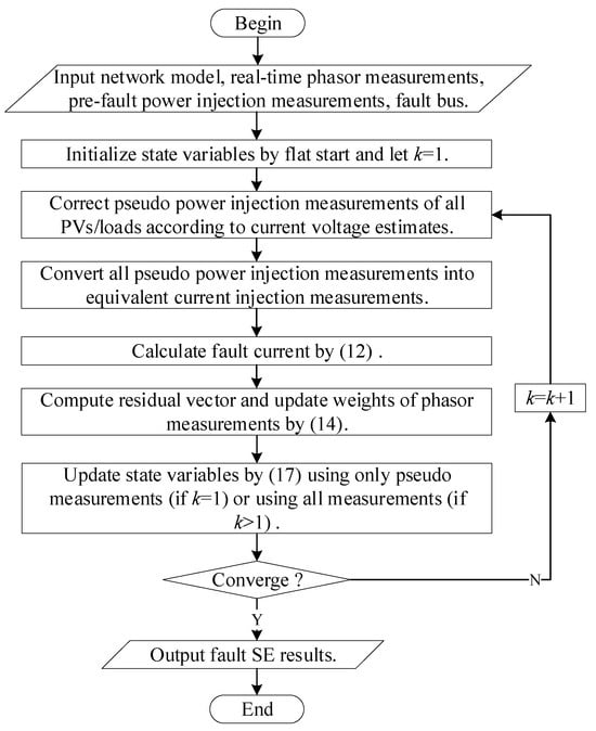 The flowchart of the robust fault SE algorithm is shown in Figure 1. It is critical to emphasize that, given the inherently low measurement redundancy in distribution networks, an additional strategy is implemented in the algorithm: during the initial iteration, state variables are exclusively updated using pseudo-measurements. Phasor measurements are deliberately deferred to subsequent iterations. This strategic ensures robustness, as dynamically adjusting phasor measurement weights in the first iteration risks allowing incorrect data to dominate the residual distribution, leading to the erroneous discarding of normally distributed measurements in subsequent iterations. Finally, the algorithm’s robustness depends on measurement redundancy: when more μPMUs are configured, it becomes more robust to incorrect data due to higher measurement redundancy; conversely, with limited μPMUs, it can only tolerate lower contamination rates.