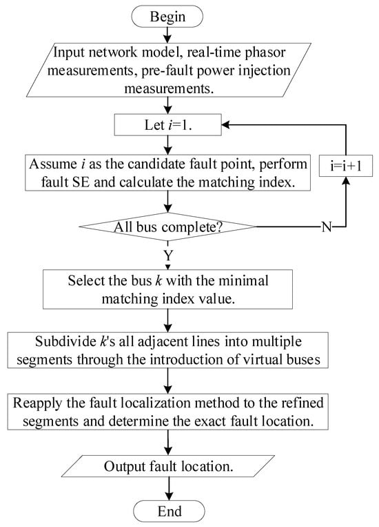 Upon identifying the bus with the minimum matching index, its adjacent lines are subdivided into multiple segments through the introduction of corresponding virtual buses. Reapplying the fault localization methodology to these refined segments enables precision improvements in fault identification. For each fault SE, the system’s admittance matrix undergoes dimension expansion to accommodate the added virtual buses. Concurrently, the measurement vector is extended by incorporating zero-injection measurements at these virtual buses, while the state vector is augmented with voltages of the virtual buses. This approach enables more precise fault localization. The fault localization algorithm is illustrated in Figure 2.