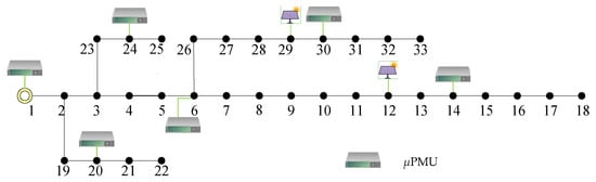 The original system is extended to an unbalanced three-phase network incorporating single-phase loads, as illustrated in Figure 3. Two PV generators are installed at buses 12 and 29. All loads are modeled as constant impedance. The placement of μPMUs is determined through offline optimization using a genetic algorithm, aiming to maximize the fault localization success rate, under the assumption that there are no incorrect data and that the total number of μPMUs is fixed. Consequently, there were six μPMUs at buses 1, 6, 14, 20, 24, and 30, with pseudo-measurements applied to all buses. The single-phase load capacities range from 60 kW + j20 kVar to 200 kW + j100 kVar. The neutral point of the transformer at bus 1 is solidly grounded. Simulations are implemented in OpenDSS [21]. The maximum number of iterations for SE was set to 20. Since the algorithm operates in actual voltage values rather than per-unit representation, a convergence threshold of max (Δx) < 0.1 V prove to be sufficient to achieve satisfactory accuracy within 3~4 iterations for the 33-bus system (12.66 kV nominal voltage), while substantially lowering computational requirements. On the other side, the variations in matching index values resulting from fault current injection at different candidate locations are substantially greater than the minor estimation errors introduced by slightly relaxed convergence criteria. Therefore, this convergence criteria is acceptable for the fault localization task.
