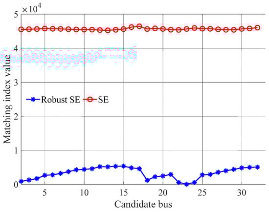 Matching index value comparison of different candidate buses using SE and robust SE-based fault localization methods.