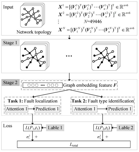 To verify the fault localization capability of the proposed robust SE method when dealing with incorrect data in real-time measurements, we conducted comparative tests using AI-based approaches, first by designing a graph neural network (GNN)-based fault localization framework. The GNN-based framework proposed in this paper consists of three stages. Stage 1 is the graph embedding phase, which uses a concatenation-based aggregation GNN model to enhance the information embedding capability for unobservable nodes in the network. Stage 2 employs an attention network to perform fault localization and fault-type identification under supervised learning. Its structure is shown in Figure 6.