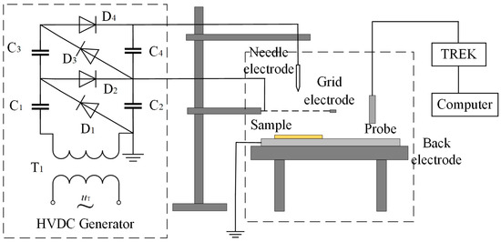 To validate the feasibility of the simulation model, SPD experiments were conducted on the EPDM/PE two-layered polymer film under −2 kV and −4 kV corona voltages. The PE films with a thickness of 0.5 mm used in the experiment were supplied by Shandong Lingxiang New Materials Co., Ltd., Weifang, China, and the EPDM films with a thickness of 1 mm were provided by Hebei Hongxiang Insulation Co., Ltd, Zhangjiakou, China. The samples were cut to a size of 25 mm × 25 mm, wiped clean with anhydrous ethanol, and then dried in a drying oven for more than 8 h. The treated samples were placed in a sealed bag and stored in a dry and dark environment for later use. The SPD experimental system, which mainly includes an HVDC generator, a needle-plate-grid electrode, a Trek-347 electrostatic potentiometer made by Lockport, NY, USA, and a computer, is shown in Figure 2. Among them, a four-stage series circuit is adopted in the power source, and a 220 V/2000 V single-phase step-up transformer is applied to the HVDC generator, with a maximum output voltage of 8 kV. The needle electrode and grid electrode are supplied by the HVDC generator. After charging the sample for 5 min, the sample is quickly moved to the position directly below the probe, and the potential values are measured and recorded. To ensure that the temperature and humidity do not affect the test results, the experiment was maintained at an ambient temperature of 25 °C and a constant relative humidity. The measured results were then compared with the simulation results.