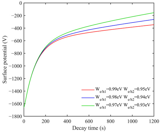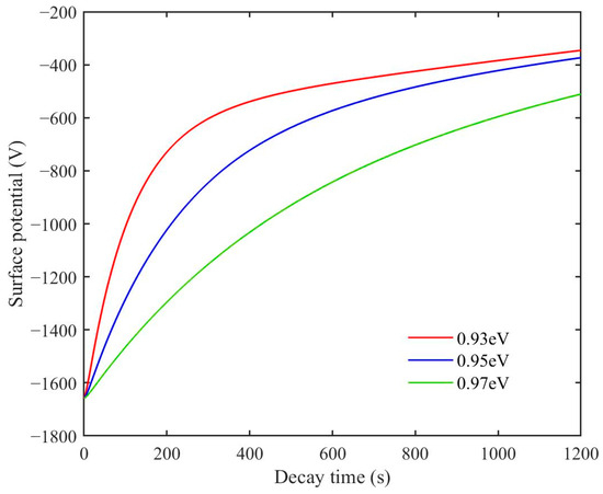 In this section, the effect of the injection barrier on the surface charge migration characteristics of the double-layer insulating dielectric surface is investigated based on nanoparticle doping. The value range of the injection barrier is relatively narrow [29,32]. Therefore, the injection barriers for EPDM are set to 0.93 eV, 0.95 eV, and 0.97 eV, and the SPDs of EPDM/PE under a negative corona voltage are obtained, as shown in Figure 4. The decay process is faster in the initial stage of SPD, after which the potential decreases more slowly. The difference in the decay rates between these two stages is primarily due to the varying trap energy levels of the surface charges on the sample. As the electron injection barrier decreases, the electron current density injected into the polymer film from the surface increases, leading to rapid surface charge dissipation.