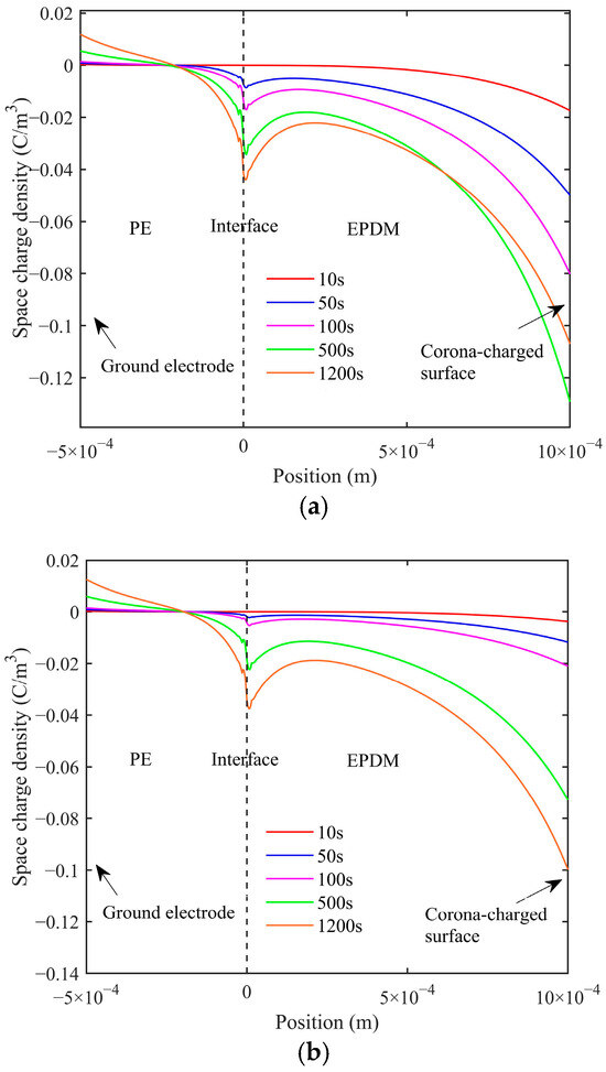 Figure 5a and Figure 5b show the space charge density distributions for injection barriers of 0.93 eV and 0.97 eV, respectively, under a negative corona voltage. Holes and electrons are accumulated near the ground electrode and the corona-charged surface, respectively. The position x = 0 marks the interface. After the charging process is completed, surface charges continue to be injected into the film, leading to a gradual increase in the space charge density at the charged surface over time. Once the pre-deposited charges are fully dissipated, the space charge density at that location begins to decrease after 1200 s due to the influence of the charge transport mechanism within the dielectric, as shown in Figure 5a.