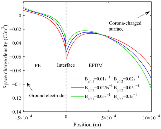 Figure 7 demonstrates the simulated space charge density distributions with different trapping coefficients after 1200 s. In the two-layered polymer film, the space charge near the insulating interface is primarily formed by charges injected from the electrodes and migrating towards the interface, with the negative polarity charge injected by the corona voltage being dominant. After 1200 s, the space charge densities at the interface for Be/h1 = 0.025 s−1 and Be/h1 = 0.01 s−1 are −0.052 C/m3 and −0.062 C/m3, respectively. When the trapping coefficient is low, the charges stored in the insulating dielectric become unstable, and most of the trapped charges are detrapped and migrate both from the surface and within the dielectric over a short period. This process results in a decrease in the space charge density at the corona-charged surface, which corresponds to the SPD. Meanwhile, the low probability of carriers being trapped during migration results in a large number of carriers migrating towards and accumulating at the two-layered dielectric interface.