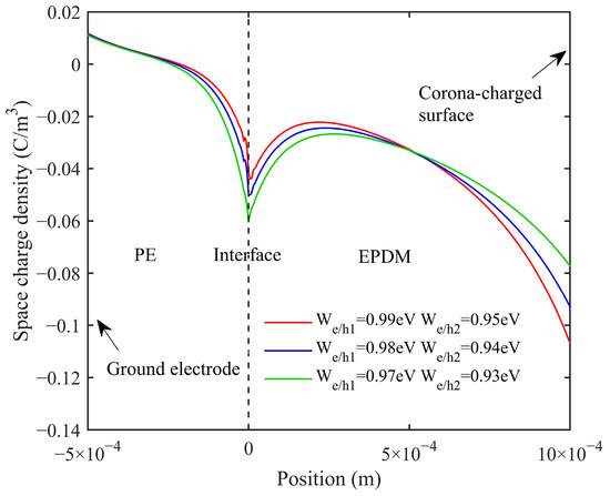 The amorphous regions in PE and EPDM contain polymer short chains, broken chains, long chains, and cross-linking points, which form traps of varying depths. These traps can capture and release charge carriers, thereby affecting the formation and accumulation of space charges in the dielectric. As the trap depth increases, the probability of charge carriers being trapped in the sample also increases. This makes it more difficult for injected electrons to migrate within the insulating layer, reducing the subsequent emission current density from the electrodes and the mobility of charge carriers near the charged surface, leading to the accumulation of a large amount of space charge near the surface. Moreover, the increased probability of trapping inevitably reduces the number of migrating mobile electrons and holes, resulting in less charge accumulation at the interface of the two-layered polymer film, with a difference of nearly 0.016 C/m3, as shown in Figure 9.