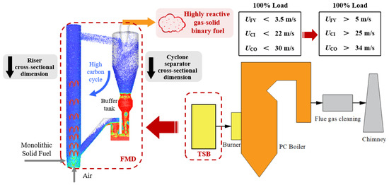 In this study, the miniaturization strategy, illustrated in Figure 1, involved integrating the highest operational known flow rates for each component of existing TSBs. The TSB was designed with a structure of circulating fluidized bed, consisting of a riser, a cyclone separator and a loop seal. A novel compact fluidized modification device (FMD) was proposed by reducing the cross-sectional dimensions of both the riser and the cyclone separator, thereby enhancing UFV (fluidized air velocity), UCI (cyclone separator inlet velocity) and UCO (cyclone separator outlet velocity).