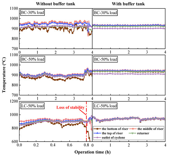 Figure 4 depicts the temperature distributions of FMD during stable operation time. Compared to the previous experimental results [21], the temperature fluctuations in the FMD are significant. BC, with good combustion characteristics, can generally sustain long-term stable operation, whereas LC cannot, which is related to the structural change of FMD. The reduced cross-sectional dimensions of the riser and cyclone separator leads to the accumulation of pulverized coal and bed material at the bottom of the cyclone separator [28], hindering the establishment of a complete cycle in the FMD and impacting its operational stability. To alleviate the problem, a buffer tank is installed at the riser of the returner. It is obvious that after the installation of the buffer tank, the temperature in the FMD becomes more stable, allowing for prolonged and stable operation. The reason is that the buffer tank provides additional space for the material discharge from the cyclone separator, thereby alleviating material accumulation issues and facilitating the establishment of the FMD cycle. Furthermore, the stability and uniformity of temperature in the FMD are influenced by the circulation rate of pulverized coal [29]. Consequently, due to less reactive combustion characteristics, the interaction between LC and air is weaker, leading to greater temperature fluctuations of the LC in the FMD.