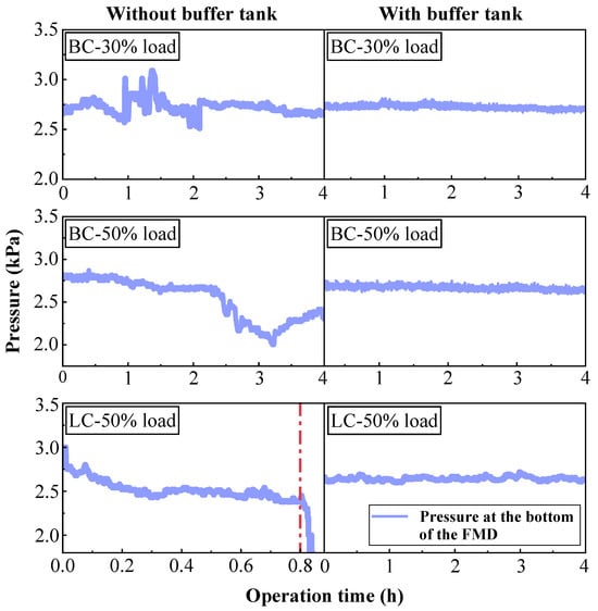 Pressure distribution at the bottom of the FMD during stable operation time with/without the buffer tank.