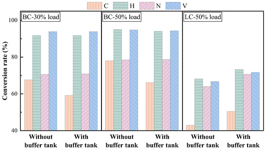 Under the conditions in the absence of a buffer tank, for BC, the conversion ratio of C was higher, which was mainly attributed to the presence of the local oxygen-rich zones mentioned previously. These combustion atmospheres in specific zones brought about increased carbon consumption. On the contrary, the conversion ratios of H, N, and V remained relatively unchanged ascribable to the inherent reactivity of BC. Whether a buffer tank existed or not, the gasification reaction rate of BC was high, and the reaction temperature within the FMD was maintained within the optimal range (Figure 4), with a relatively balanced thermal load and stable reaction conditions (Figure 5). For LC, the high ash and low volatile matter content indicated a lower inherent reactivity. Nonetheless, upon integrating the buffer tank, the FMD’s operation attained enhanced stability, enabling a more evenly distributed thermal load and reducing occurrences of excessive pyrolysis and carbonization [31]. This enhancement improved the fluidization state within the FMD, thus increasing the organic component release rates.