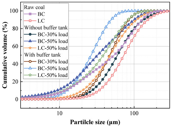 Figure 8 depicts the particle size distribution of preheated char and raw coal. For both BC and LC, the particle size of preheated char was significantly smaller compared to that of raw coal. It was notably observed that the particle size of preheated char at 30% load without the buffer tank was larger than that of raw coal. The reason was that the decreased air volume diminished the contact frequency between the primary air and pulverized coal, thereby inhibiting the erosion of carbon skeletons. Furthermore, the cyclic char captured by the cyclone separation was prone to stick in the loop seal without the buffer tank due to the higher H2O content in BC, resulting in a significant increase in the particle size of the preheated char. Following the installation of the buffer tank, a further reduction in the particle size of preheated char was observed, indicating that the buffer tank facilitated a more uniform mixture of gas and solid phases while enhancing fluidization characteristics, thereby promoting stable operation of the FMD. Consequently, the interaction between preheated gas and char became more efficient, leading to a reduction in particle agglomeration and an enhancement in the fragmentation of larger particles.