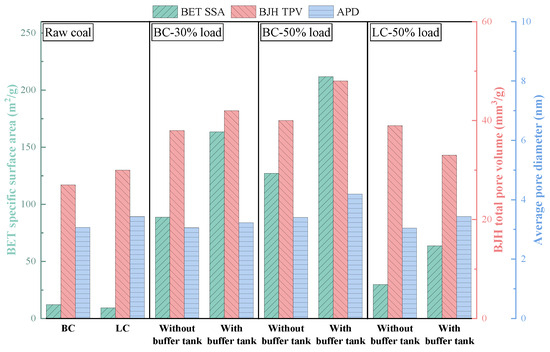 SSA, TPV and APD of preheated char and raw coal with/without the buffer tank.
