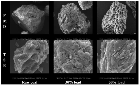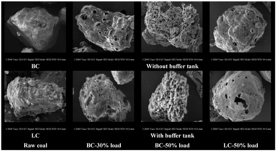 Figure 10 shows the apparent morphology analysis of preheated char and raw coal. Both BC and LC exhibited a smooth surface and dense texture. In contrast, bubbly or honeycomb-like micropores were distributed throughout the preheated char. This formation occurred as the pulverized coal particles underwent thermal stress during the fuel fluidization process within the FMD, leading to further breakdown of larger particles. Concurrently, the release of volatile substances along with partial gasification and combustion reactions contributed to the development of micropores and cracks [33]. Additionally, following the installation of the buffer tank, both the quantity and size of pores on particle surfaces increased (Figure 9). This enhancement could be attributed to more stable material circulation and uniform temperature achieved within the FMD (Figure 4), which facilitated a greater release of volatile substances (Figure 7). Furthermore, while uniform temperature reduced thermal stress on particles, decreased particle size coupled with an increase in SSA resulted in heightened thermal stress [34].
