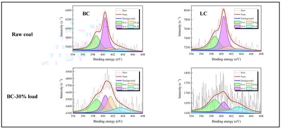 The fitting results of XPS-N1s spectrum of preheated char and raw coal are illustrated in Figure 11. According to the results of XPS, Pels [35] classified the existent morphology of N functional groups into N-5, N-6, N-Q and N-X. The relative content of nitrogen-containing functional groups was defined as the ratio of the area corresponding to these groups to the total area under the XPS-N 1s spectral curve. Consequently, the relative content of nitrogen functional groups in raw coal and preheated char can be determined by integrating the area beneath this curve [20].