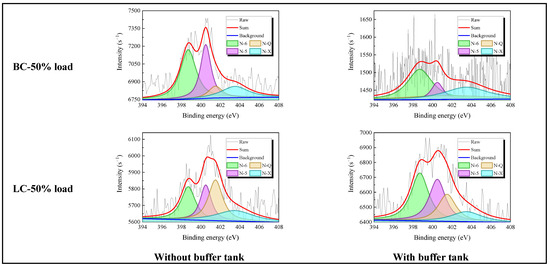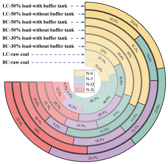 Figure 12 depicts the relative content of N functional groups in preheated char and raw coal. The levels of N-5 and N-6 in raw coal were relatively high, with their combined proportion exceeding 70%, indicating that N atoms were predominantly located at the periphery of organic aromatic structures [36]. At a load of 30%, the relative content of N-Q without a buffer tank was significantly higher than that with it, correlating with difference in particle fluidization characteristics. In the presence of the buffer tank, recycled char particles captured by the cyclone separator tended to disperse more extensively, facilitating chemical erosion of the carbon structure. Consequently, N atoms at the center of aromatic structures were more likely to migrate towards the edges through cracking, leading to substantial consumption and conversion of N-Q. The relative content of N functional groups in preheated char at 50% load differed from that at 30%. Specifically, without the buffer tank, the relative content of N-5 and N-6 were significantly higher than those with it. This variation arose because increasing the load from 30% to 50% augmented circulating char amounts, resulting in more frequent interactions between char particles and enhancing likelihood without a buffer tank. Although the conversion of N-Q remained inhibited without the buffer tank, the conversion of N-5 and N-6 was similarly constrained due to poor fluidization conditions. Additionally, raw coal contained relatively high levels of N-5 and N-6, indicating that these compounds were better preserved in preheated char. Conversely, when the buffer tank was present, significant conversion occurs for N-5 and N-6 into gaseous components like HCN and NH3, which resulted in higher relative contents of both N-Q and N-X compared to the scenario lacking a buffer tank.