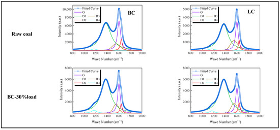 Figure 13 presents the Raman spectrum intensity and peak fitting of preheated char and raw coal, with the laser scanning range configured as 800~2000 cm−1, which encompassed one Gaussian peak (D3 band) and four Lorentzian peaks: G band, D1 band, D2 band, and D4 bond. The relative area ratios of Raman spectral bands (IG/IAll, ID1/IG, (ID3 + ID4)/IG) served as indicators for analyzing changes in the carbon microcrystalline structure [37]. Figure 14 shows Raman analysis of preheated char and raw coal.