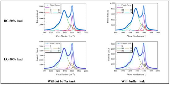 Raman spectrum intensity and peak fitting of preheated char and raw coal with/without the buffer tank.