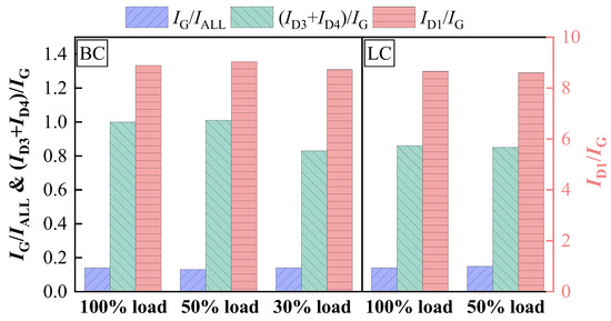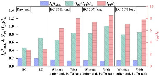The Raman analysis of preheated char at different loads is shown in Figure 22. For BC, at 50% load, the number of active sites was maximized on the surface of preheated char particles, while the degree of graphitization decreased. At 100% load, a larger primary air volume shortened particle residence time. Conversely, at 30% load, a smaller primary air volume reduced the effective contact rate between O2 and particles. Both scenarios diminished the destructive effect of O2 on carbon ring structures, which corresponded with the observed SSA of preheated char and C conversion ratio (Figure 17 and Figure 19). Furthermore, when the load dropped to 30%, a significant decrease in (ID3 + ID4)/IG indicated that O2 content played a more critical role in enhancing carbon microstructure than particle residence time. For LC, reducing the load increased IG/IAll while both ID1/IG and (ID3 + ID4)/IG decreased, suggesting an increase in graphitization degree for preheated char alongside fewer active sites on particle surfaces and reduced defective carbon structure. This change could result from lower FMD temperatures at reduced loads that slowed gaseous reactant diffusion during fuel modification. Additionally, decreased O2 content at lower loads lessened its destructive impact on carbon bonds within aromatic layers.
