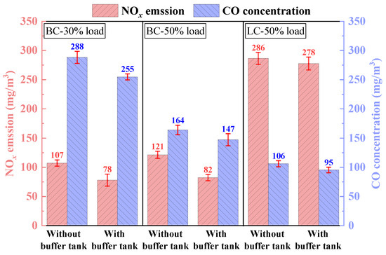 Figure 15 illustrates NOx and CO emission, and all data have been converted to the standard value at 6% oxygen concentration (@6% O2). Following the installation of the buffer tank, a significant reduction in CO concentration was observed, illustrating a decrement in the incomplete combustion of preheated char. This reinforcement was ascribable to the augmented reactivity of BC and LC resulting from fuel modification. Throughout the initial phase of combustion, the increase in CO concentration effectively intensified the homogeneous reduction reactions involving NOx (Figure 6). With the introduction of burnout air, char-N was released and partially engaged in heterogeneous reduction reactions on its surface. Thus, a well-defined reduction zone and burnout zone could be established within the combustion reaction area. As noted in the previous analysis (Figure 9 and Figure 14), demonstrated that the buffer tank increased both active site density and SSA of preheated char, facilitating O2 diffusion within it while enhancing its combustion reactivity in the UFC, which also provided additional opportunities for reductions of NOx. Furthermore, during fuel modification processes, an increased N conversion ratio suggested that more fuel-N was extracted from FMD and reduced to N2 (Figure 7). As a result, there was a decrease in fuel-N entering UFC, thereby diminishing its potential transformation into NOx.