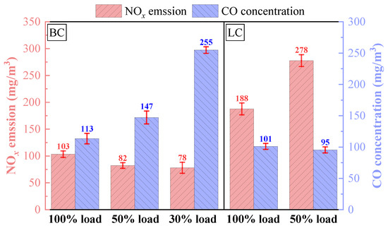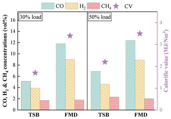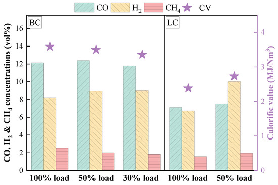 Figure 16 depicts principal components and CVs of combustible gas. For both BC and LC, when the load was decreased from 100% to 50%, the contents of H2 and CO increased, while that of CH4 diminished. This change occurred because, at a lower load, both the coal feed rate and primary air volume were reduced, leading to an extended residence time which facilitated the release of volatiles and enhanced gasification reactions [39]. Given that volatile matter constituted the primary source of CH4, reactions (1) and (3) were enhanced, resulting in a decrease in CH4 content alongside an increase in CO and H2. Notably, for LC, CH4 content exhibited an increase when the load was reduced. This phenomenon correlated with a reduction in FMD temperature. As reaction (1) was endothermic, a reduction in load inhibited this reaction, leading to a slight increase in CH4 content due to the combined effects of both factors. Furthermore, the CV of CH4 was significantly higher than that of H2 and CO, consequently, variations in CV aligned harmoniously with changes observed in CH4 content. As the load was further diminished to 30%, there was a significant reduction in the primary air volume and the spatial density of the fuel, which led to a considerable decline in the effective contact rate between the fuel and O2. This phenomenon further inhibited reactions (3) and (5), culminating in a reduction of CO and CO2 content.