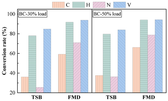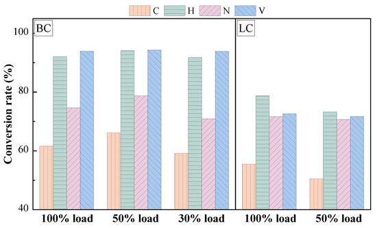 According to the ash balance hypothesis [30], the calculation results of the conversion ratio of each component during fuel modification are illustrated in Figure 7. For BC, the conversion ratios of H and V were over 90%, illustrating that almost all the volatiles were released in the FMD. By contrast, the conversion ratios of H and V for LC were lower than those for BC, which was related to the higher ash content. More organic components were wrapped inside its ash shell, hindering their release. The conversion ratios of N exceeded 60%, illustrating that most fuel-N was released in the FMD and then tended to be reduced to N2 due to the reducing atmosphere. Hence, higher N conversion ratio greatly reduced the possibility of NOx generation in the subsequent combustion.