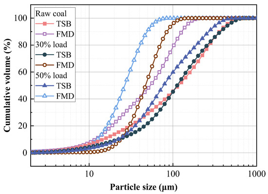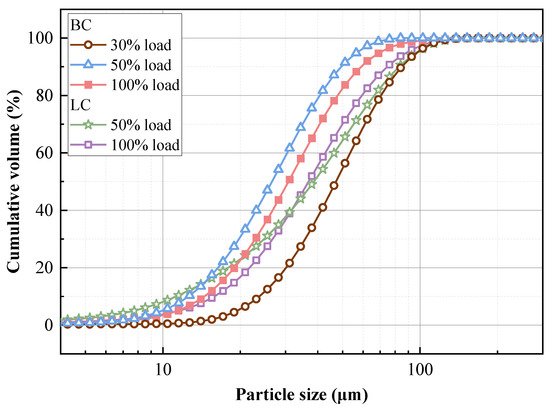 Figure 18 shows the particle size distribution of preheated char at different loads. For BC, the particle size of preheated char reached its minimum at 50% load. At 100% load, the heightened UFV significantly reduced particle residence time, detrimentally impacting cyclone separator efficiency at elevated cycle rates and resulting in the escape of larger particles. Additionally, at 30% load, the diminished frequency of particle collisions and the comparatively lower reaction rate culminated in larger particle sizes than those observed at a 50% load. In contrast, for LC, the particle size of preheated char at 100% load was marginally smaller than that at 50% load, as the increased FMD temperature enhanced combustion and gasification reactions on the surface of pulverized coal (Figure 4), thereby accelerating both large particle disintegration and small particle consumption.