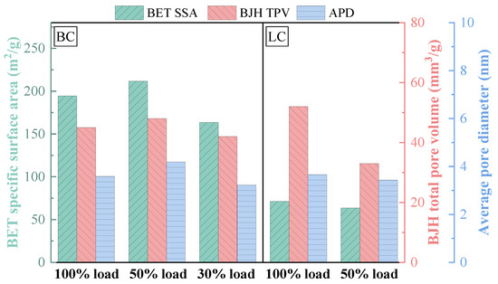 Figure 19 illustrates the SSA, TPV and APD of preheated char at different loads. For BC, at 50% load, SSA, TPV, and APD of preheated char attained their zenith, signifying a more developed pore structure associated with collisions among pulverized coal particles, thermochemical reactions within the riser, and the disturbance of gas to pulverized coal particles [23]. As illustrated in Figure 15, the fluidization characteristics in the FMD were optimal at 50% load, leading to the strongest interaction between gas components and char particles. The uniform FMD temperature cultivated favorable conditions for gasification reactions, thereby enhancing pore formation both internally and on the surface of pulverized coal particles. Furthermore, the smallest particle size at this load contributed to the maximum observed SSA. In contrast, for LC, SSA, TPV, and APD of preheated char escalated with increasing load. Unlike BC, the FMD temperature for LC rose with increasing load, which enhanced collisions and gasification reactions between particles, thus significantly refining pore structure at elevated loads.