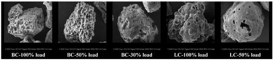 Figure 20 depicts the apparent morphology analysis of preheated char at different loads. For BC, at 50% load, the formation of micropores on the surface of preheated char was enhanced due to stable material circulation and uniform FMD temperature promoting volatile release (Figure 17). In contrast, for LC, the pore structure of preheated char at 100% load was superior, attributed to high primary air volume and heating rate that increased thermal stress on pulverized coal particles. Additionally, the small particle size and large SSA of preheated char further amplify this thermal stress effect (Figure 18 and Figure 19). Consequently, the pore structure of preheated char improved significantly, with BC and LC achieving optimal enhancements in particle pore structure at 50% and 100% loads, respectively.