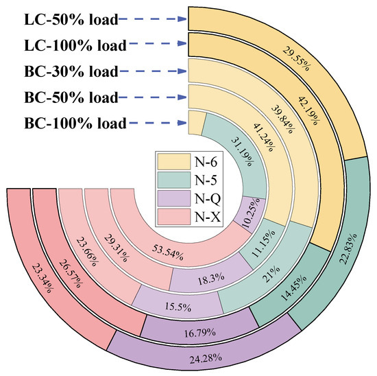 Figure 21 presents the relative content of N functional groups in preheated char at different loads. At 100% load for BC, the increased primary air volume and UFV led to a higher concentration of O radicals. As previously analyzed, the increased SSA and improved pore structure of preheated char facilitated the combination of O and N-6, resulting in the formation of N=O bonds and promoting N-X creation (Figure 12). Consequently, the content of N-X reached its peak, while the content of N-6 was at its lowest. When the load decreased to 50%, the extended particle residence time allowed for greater cleavage of C-C and C=C bonds. In this scenario, both O within N-X and environmental O participated in oxidizing C atoms. As the N-O bond broke, N-X was converted to N-5. Due to its high reactivity, N-5 tended to convert into volatile compounds and reverted back to N-6 at elevated temperatures. Simultaneously, reduced O atom content inhibited conversion from N-6 to N-X, increasing relative content of N-6. Additionally, nitrogen-containing aromatic heterocycles were prone to polymerization, causing nitrogen groups at char edges to condense into interiors forming more stable forms like N-Q, which also explained increased relative content of N-Q in LC during load reduction. Further reducing load to 30% continued promoting conversion from N-X to N-5 due to the uniform FMD temperature. However, decreased primary air volume and O content inhibit conversion from N-6 to N-X, resulting in an increase in relative content of N-6. Some studies suggest that when temperature exceeds 700 °C with O atoms present, N-6 reactivity increases, fostering its conversion to N-5 [40]. Thus, the combined influence of these factors keeps the relative content of N-6 relatively stable.