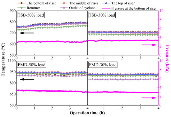 Figure 5 presents the pressure distribution at the bottom of the FMD during stable operation time. For the FMD without a buffer tank, significant reductions in bottom pressure were observed under varying loads during BC combustion. Nevertheless, throughout this operational period, the FMD can maintain continuous operation via self-regulation. Conversely, when combusting LC, there was a drastic decline in bottom pressure, signifying a distinct phenomenon of bed material escape. After approximately 0.8 h of operation, the stability of FMD became impossible to sustain. For the FMD with a buffer tank, whether BC or LC as fuel, the fluctuations in bottom pressure were significantly attenuated, and the continuous operational duration exceeded 4 h, which suggested that incorporating a buffer tank effectively enhances the operational stability of the FMD.