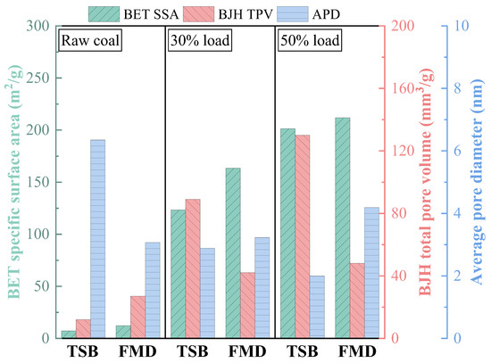 Figure 9 presents the SSA (specific surface area), TPV (total pore volume) and APD (average pore diameter) of preheated char and raw coal. In comparison to raw coal, the SSA, TPV, and APD of preheated char exhibited significant increases. This enhancement was attributed to the release and partial combustion of volatile substances during fuel modification, which facilitated the formation of micropores and contributed to the collapse of the carbon skeleton in raw coal, indicating a more developed pore structure and a substantial improvement in the physical properties of preheated char. With the installation of the buffer tank, both material circulation and gas-solid separation efficiency were enhanced, which helped prevent aggregation among preheated char particles while increasing their rolling motion and mutual abrasion, thereby giving rise to excellent modification characteristics, which aligned with the conclusions drawn in studies [24], indicating a negative correlation between particle size and SSA (Figure 8). Additionally, the buffer tank contributed to a more uniform internal temperature within the FMD. Given the high sensitivity of volatiles to temperature [32], this uniformity facilitated the formation of additional pores and cracks on char particle surfaces, consequently enhancing their TPV and APD. Notably, the TPV of LC’s preheated char decreased following the installation of the buffer tank, which could be attributed to LC’s lower volatile matter content relative to BC. However, the SSA increased, indicating that the buffer tank could significantly enhance the development of a porous and loose structure during fuel modification for coals with a high volatile matter content, while effectively promoting an increase in fine particles for coals with low volatile matter content.