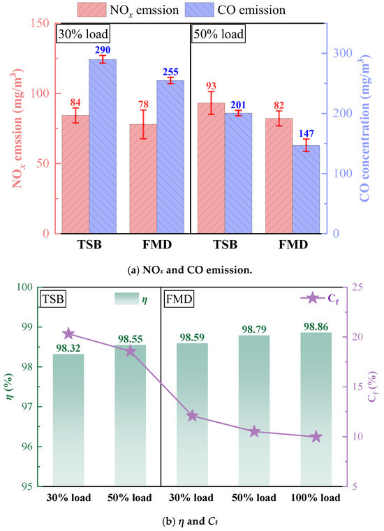NOx emission, CO concentration, η and Cf for FMD and TSB.