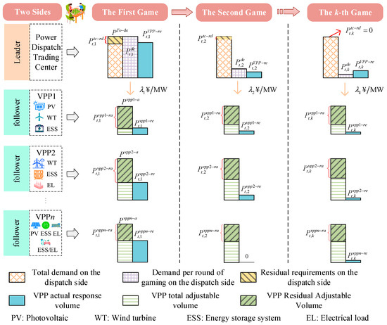 During the first gaming process, the power dispatch and trading center determines the type of auxiliary services required and the amount of power demanded based on the real-time operating status of the grid and gives priority to the release of pricing strategies. Then, each VPP calculates the optimal response power based on the price signal and feeds the result back to the trading center. If the total response power deviates from the demand beyond the threshold, the trading center further updates the tariff strategy, triggering a new round of gaming. In the subsequent game, the trading center can guide the power dispatch of multiple VPPs through price optimization, and the power dispatch decisions of multiple VPPs will also affect trading with the ancillary services market. Finally, when the joint solution of tariff strategy and response power satisfies the Nash equilibrium condition (i.e., either participant cannot unilaterally change the strategy to improve its own revenue), the game reaches a stable state, and the trading center generates the clearing tariff and completes the settlement accordingly. The transaction interaction process between the two is sequential, in line with the master–slave dynamic game, and the detailed process of the game is shown in Figure 1.