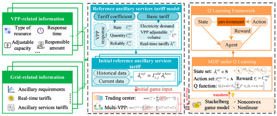 Current research extensively employs various game-theoretic frameworks, such as master–slave games and non-cooperative games, to analyze the interactive behavior between grid operators and VPPs. For example, references [11,12,13] utilize Stackelberg game theory to construct interaction models between multiple VPPs and the grid, considering the interests and demands of different subjects. These models effectively achieve collaborative optimization among VPPs and grid interaction. Reference [14] proposes a Stackelberg game-based optimization platform for electricity trading and scheduling, facilitating market participation of VPPs. In addition, other game theories have been used to conduct research. For example, references [15,16] employ dynamic games to develop day-ahead market optimization models for multi-VPP systems, enabling optimal benefit allocation under complex gaming scenarios. Although all of the above studies have adopted the ideas of game theory to solve the problems related to VPPs, the initial tariffs of the game are generally set empirically. However, due to the different types of resources aggregated by different VPPs, there is a gap in their overall response characteristics. If the detailed information of various types of VPPs and the grid side is not considered in the initial tariff setting, it will lead to a large deviation between initial and final clearing price, which increases the number of interactions between multiple VPPs and the grid, i.e., it increases the game iteration and computation time and, thus, reduces the efficiency of market clearing.