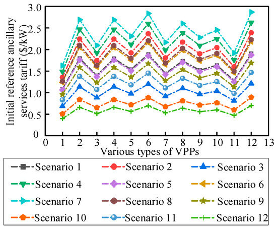 This subsection analyses the above reference ancillary services tariff model, in order to verify the reasonableness and validity of the proposed model. The initial reference ancillary services tariff for each VPP under different scenarios is firstly given, as shown in Figure 4. Then, by simulating the 12 scenarios, the relationship between the power demand and the total response of VPPs under each scenario is also derived, as shown in Figure 5.