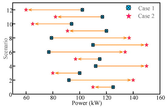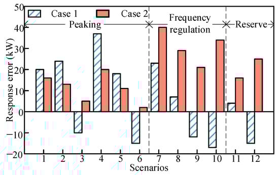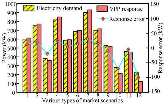 This subsection compares the responses to the above two scenarios. The obtained errors of the final response of the VPP with respect to the electricity demand under the 12 scenarios are shown in Figure 6. As can be seen from the figure, under the peaking demand scenarios (Scenarios 1–6), the average absolute error of the case 2 final response is 11.17 kW, while the average absolute error of the case 1 final response is 20.67 kW. This is due to the fact that under case1, the trading center is unable to fully grasp the re-responsiveness of various types of virtual power plants, which leads to the formulation of tariffs that are difficult to better meet the willingness of various types of virtual power plants to respond, and ultimately leads to a larger deviation. Except for Scenarios 3 and 6, the final response errors in case 2 are small. In Scenarios 3 and 6, the final response error of case1 is negative, i.e., the response fails to meet the demand. This indicates that by setting different reference auxiliary service tariffs, the VPPs can be better incentivized to respond to the demand and ensure that the trading demand is reached. In contrast, not considering the reference ancillary services tariff will affect the response of each VPP and reduce the efficiency of trading. This proves that the proposed model is highly accurate when oriented to peak demand. In the frequency-regulated demand scenarios (Scenarios 7–10), the average absolute error in the final response for case2 is 31 kW, while the average absolute error in the final response for case 1 is 14.75 kW. Although the final response error of the proposed model is larger, it is negative in both Scenario 9 and Scenario 10 when the reference ancillary service tariff is not considered. This demonstrates the high reliability of the proposed model under the frequency regulation scenario. This indicates that considering reference ancillary service tariffs can take into account the interests of all types of VPPs and ensure that demand is met, with higher reliability, while not considering reference ancillary service tariffs reduces reliability due to under-responsiveness because it fails to accurately take into account the response information of some VPPs. In the reserve demand scenarios (Scenarios 11–12), the average absolute error in final response for case 2 is 20.5 kW compared to 9.5 kW for case1. However, in Scenario 12, the response error for case1 is negative. This indicates that the proposed model has high reliability in the standby scenario as well. In conclusion, without considering the auxiliary service reference tariff, there is a situation where the demand cannot be met in time, whereas with the consideration of the auxiliary service reference tariff, all the scenarios can meet the demand although some of the scenarios have a large re-response error, which proves the validity of the proposed model.