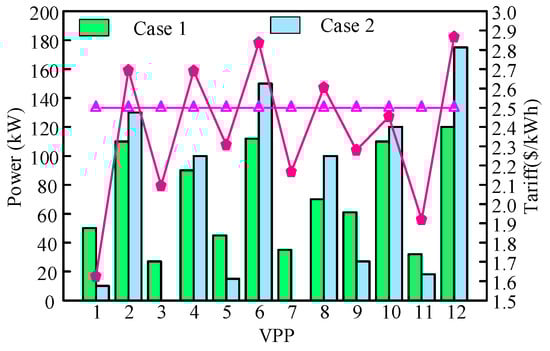 As can be seen in Figure 4, the reference auxiliary service tariffs for each VPP vary across scenarios, with Scenario 7 having the highest average reference auxiliary service tariff and Scenario 4 the second highest, which is due to the fact that these two scenarios have the highest electricity demand, and setting higher reference auxiliary service tariffs can better incentivize the VPPs. In addition, both VPP6 and VPP12 have relatively high reference ancillary service tariffs in the same scenarios due to the higher tariff factor component of these two VPPs with better historical response. In Figure 5, the average error between the total response power volume of VPP and the electricity demand under the consideration of the reference auxiliary service tariff is 27.08 kW for the 12 kinds of scenarios, which is much smaller than the average value of the electricity demand of 576.5 kW. Although there is some error between the obtained VPP total response power and electricity demand, the trend is consistent, so the proposed model is reasonable and effective, and the reference auxiliary service tariff can be used as the initial tariff for the input of the game model.