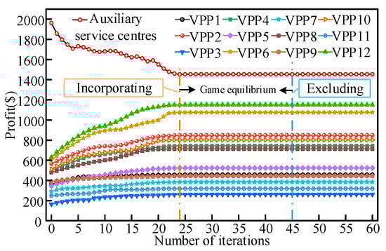 Firstly, Scenario 4 is taken as an object to analyze the game process of each VPP when considering and disregarding the reference auxiliary service tariff, based on the objective function of each participant, and the results of the analysis are shown in Figure 9. As can be seen from the figure, VPP12, VPP6, VPP2, and VPP10 show the largest increases, partly because of their larger responsive capacity, and partly because of the relatively high reference ancillary service tariffs given by the auxiliary service centers to these VPPs to ensure that the trading is completed. In addition, the number of iterations of the game equilibrium when the reference auxiliary service tariff is considered is 24, while the number of iterations when it is not considered is 45, which can be seen that the number of iterations used in the game is significantly reduced after the introduction of reference auxiliary service tariff. This shows the superiority and effectiveness of the reference auxiliary service tariff model proposed in this paper.