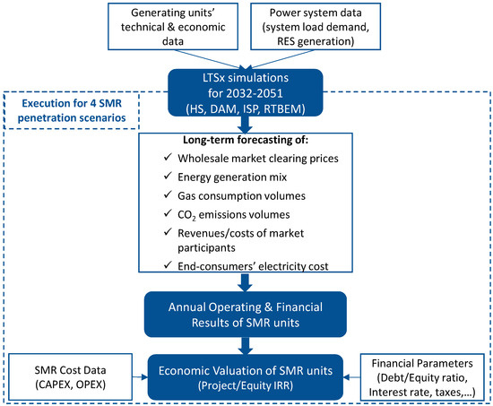 - A scenario-based simulation analysis to investigate the potential operational and economic implications arising from the construction and operation of SMR units in Greece is conducted. To the best of the authors’ knowledge, this is the first time that the impact of integrating this novel power generation technology in modern power systems and wholesale electricity markets under different penetration levels is assessed in quantitative terms for a long-term horizon. Our goal is to provide an accurate view of the tangible benefits that these units may bring to the power system operation and, in turn, the society welfare, in terms of mitigating the dependence on natural gas imports, reducing carbon emissions and associated costs, as well as examining potential electricity cost savings for end-consumers. The long-term economic viability of such innovative power generation projects is also investigated from the investor’s perspective through a detailed economic valuation analysis. While the Greek power system and electricity market serve as our case study, this analysis offers valuable insights into the multi-dimensional benefits of this new power generation technology, enabling similar analyses in other regions.