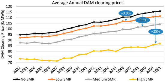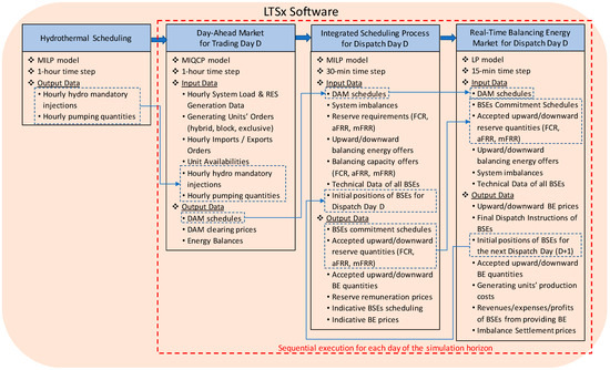 - Despite the long-term perspective of this analysis, all relevant wholesale electricity market processes, namely Day-Ahead Market (DAM), Integrated Scheduling Process (ISP) and Real-Time Balancing Energy Market (RTBEM) are sequentially simulated on a daily basis under finest time resolution ranging from 1 h (DAM) to 30-min (ISP) and down to 15-min (RTBEM). This allows for the effective modeling of the large set of inter-temporal constraints pertaining to the system and generating units’ actual operation and, therefore, provides a realistic assessment of their impact on the market solution results as well as on the long-term economic viability of SMR units. This is achieved by using a powerful market simulation software tool, which emulates the detailed functionalities of the official optimization solvers used by the associated Greek electricity market and power system operation institutions (Market/System Operators) for solving the actual Greek wholesale electricity market.
