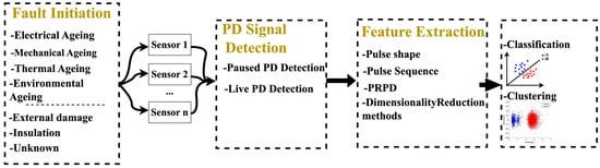 The process of PD detection, as shown in Figure 2, starts with fault initiation. PD signals are then detected using various sensors, followed by feature extraction (pulse shape, sequence, phase-resolved PD (PRPD), dimensionality reduction) and data analysis (classification and clustering). Detection, localization, and making decisions are the last three phases of PD diagnostics [18,26]. The decision-making stage is based on experience relating to PD magnitude, which may eventually lead to cable repair. Knowing the specific place of PD incidents in cables is crucial since it may enable engineers to determine how severe the faults are and speeds up the maintenance operation [12,25,27].