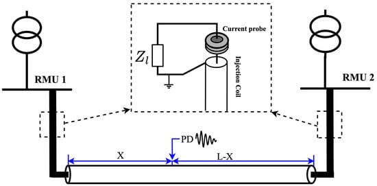 Specific criteria are established to assess and compare the strengths and limitations of different strategies. These criteria encompass the independence of arrival time from the noise level and bandwidth, wave shape and amplitude, recorded signal duration, and pulse position within the signal. The approaches must be resilient against reflections from joints and RMUs and provide precise integration of arrival timings for both injected and monitored PD pulses [36]. A schematic sketch of the test set-up is illustrated in Figure 5. The testing configuration includes two RMUs with an MV/LV converter [33,36]. The difference in time of arrival at both terminals will be utilized, combined with , to compute the location of the PD: