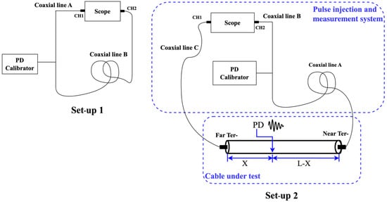 The configuration of this technique is indicated in Figure 6. In both configurations, a PD calibrator is linked to two different lengths of coaxial wire by a T-connection to calibrate the PD detection systems and analyze the cable response. At first, as shown in set-up 1 Figure 6, Line A is short-circuited, and the measurement result from this set-up is referred to as . This term emphasizes the individual line involved in the short-circuit arrangement. In set-up 2 Figure 6, coaxial wire A is linked to the PD calibrator and the near terminal of the cable, while the other terminal, far terminal, is connected to channel 1 of the scope by the coaxial wire C. As the cable is linked to Line A, the related information is gathered, and the measurement result from this set-up is referred to as .